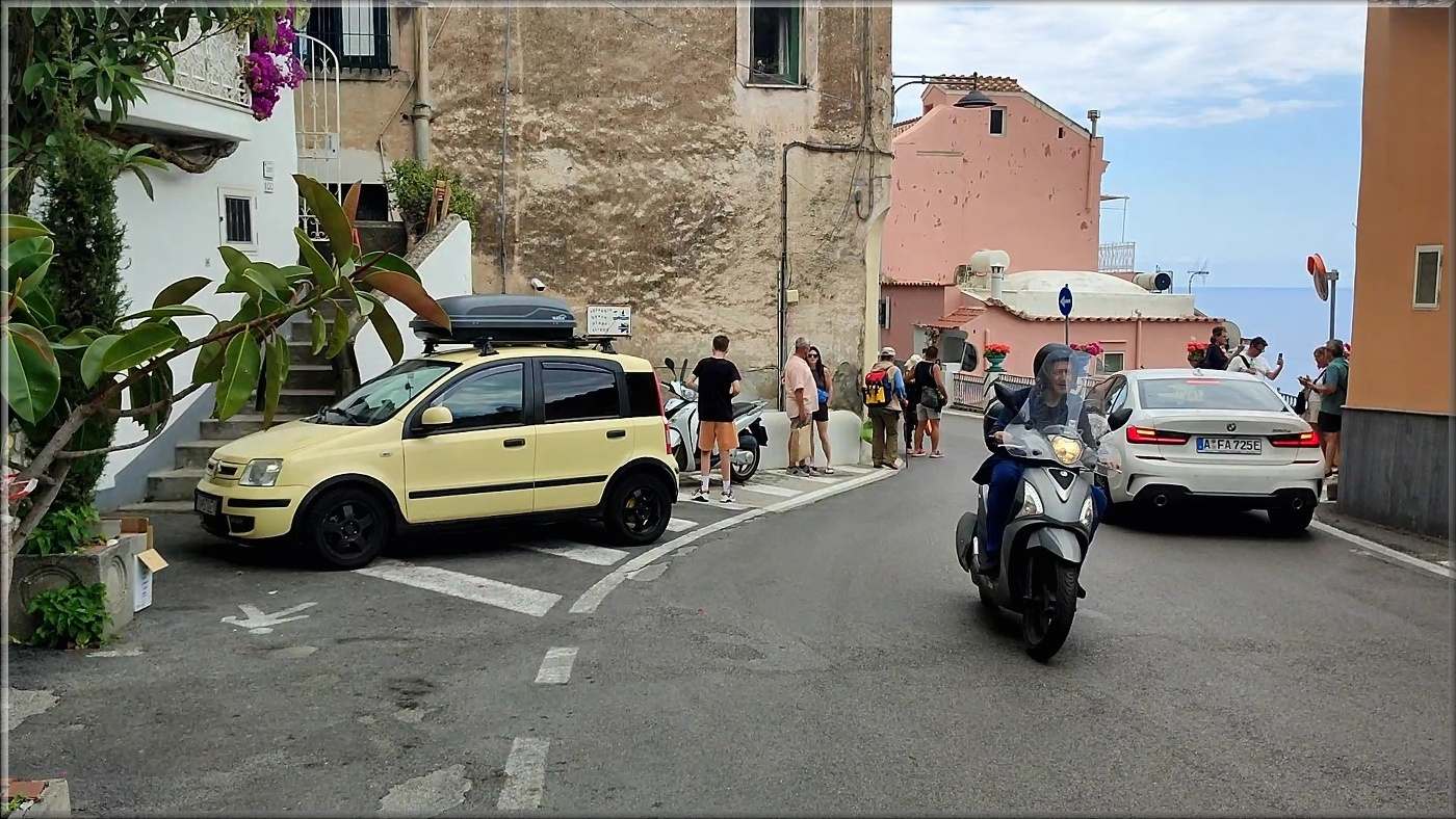 Po neúnavnom krútení volantom, a keď som po pedáloch dupal ako klavírový virtuóz, dorážame do Positana. Tu je oproti Amalfi jeden rozdiel: Tu sa seriózne nedá zaparkovať! Takže prepínam hlavu do módu drzého domáceho taliana, a zaparkujem bez škrupúľ na hulváta!
