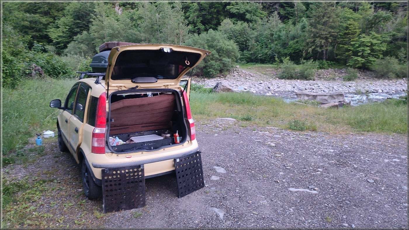 Dnes šípime menší problém s hľadaním nocľahu. Prechádzame totiž pohorím Apeniny, rôznymi dolinami. Tie sú úzke, a miestami je iba rieka a cesta a hneď kopce. Našťastie sme s tým rátali, a máme časovú rezervu. Vyskúšame to zapichnúť na horskom priechode Passo dell'Abetone. Je to však lyžiarska oblasť, a tak všetky dostupné parkoviská sú platené. Pokračujeme ešte pár kilometrov a za dedinou Pievepelago to nekompromisne parkujeme dolu pri rieke.